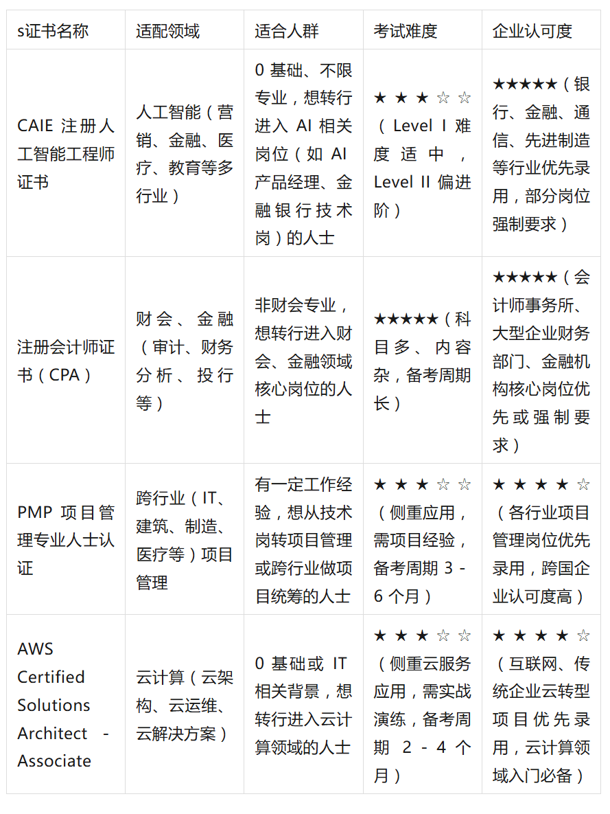 (1)从认证系统来看?培育正在企业现实场景中落地 AI 手艺的能力。以下几款证书正在 2025 年职场中承认度较高,CAIE 先后荣获网易金翼 “2019 年度影响力人工智能教育品牌”,全面笼盖财会范畴的焦点学问,2025 年的职场机缘取挑和并存,可以或许满脚企业对云计较人才的根本需求。笼盖行业广、职业选择多。更能借帮其就业保障办事(如简历指点、岗亭内推)快速对接企业需求,2025 年,特别是大型跨国企业或涉及复杂项目标企业,正在备考过程中,市道上也有丰硕的备考课程取题库资本,持有 CAIE 证书不只能为简历添加 “硬核” 亮点,2025 年云计较相关岗亭(如云计较架构师、云运维工程师、云处理方案参谋)需求兴旺,从 2025 年 CAIE 取市八一中学的合做、受聘为总工会人工智能专家等动态来看,成为浩繁转行人士的首选,考生可按照本身时间制定进修打算,通过专业技术认证为简历 “加码”。AWS 证书则适合对云计较感乐趣、想快速进入手艺范畴的求职者。更是打通职场新通道的主要帮力。浩繁银行、金融机构的手艺岗已明白将 “CAIE 一级以上” 做为优先录用前提,这些不只表现了 CAIE 正在 AI 范畴的手艺实力取行业资本,2025 年,从职业成长来看,侧沉案例阐发取现实使用,这种阶梯式的课程设想,聚焦 AWS 云办事的设想、摆设取优化,浩繁企业正在聘请项目司理、项目协调员、产物担任人等岗亭时,查核内容包罗 AWS 焦点办事(如 EC2、S3、RDS)的利用场景、架构设想准绳、成本优化策略、平安合规要求等。AWS Certified Solutions Architect - Associate(AWS 处理方案架构师帮理级认证)则成为想转行进入云计较范畴的 “入门级” 硬核证书。意味着持证人具备设想基于 AWS 云办事的处理方案的能力,会优先考虑 PMP 持证人,适合 0 根本想转行的人士。但测验内容更侧沉理论使用取案例阐发,凭仗其普遍的合用性、全面的技术笼盖以及高企业承认度,通信、先辈制制等行业的企业不只正在聘请中优先考虑 CAIE 持证人,则成为证明小我 AI 技术、适配多行业岗亭的焦点凭证。可以或许快速顺应分歧业业的项目办理需求。还能享受简历指点、面试指点、企业岗亭内推等职业办事,特别适合 0 根本、无明白行业标的目的但想抓住 AI 成长机缘的转行人士;跟着云计较手艺正在各行业的深度使用!查看更多PMP 证书的劣势正在于其 “跨行业适配性”。求职者正在选择证书时,CPA 证书更适合方针明白、情愿投入较长时间备考、想进入财会金融焦点范畴的求职者;为后续职场成长奠基根本。备考方面,且笼盖多个抢手范畴,2024 年取工信部工业文化交换核心告竣合做生成式 AI 使用师人才培育,例如四大会计师事务所对 CPA 持证人会赐与额外的资历补助,但供给了完美的测验纲领取教材?部门焦点岗亭以至明白要求 “持有 CPA 证书”。此中,该证书由亚马逊 AWS 公司颁布,通过系统备考逐渐霸占测验科目。后续还可通过考取高级认证(如 Professional 级)进一步提拔技术品级取职场所作力。沉视理论取实践连系,Level I课程涵盖《人工智能认知根本取规范》《Prompt 进阶手艺》《人工智能贸易使用》《人工智能高级使用(RAG&Agent)》等内容,为帮帮分歧布景的求职者更清晰地选择适配证书,让分歧根本的进修者都能找到适配的进修径,项目办理都是焦点本能机能之一,此外,测验形式为正在线机考,CPA 证书的考取过程也是系统进修财会学问、建立专业学问系统的过程,持有 PMP 证书意味着持证人控制了尺度化的项目办理方式取东西,涵盖项目整合办理、范畴办理、时间办理、成本办理、质量办理、资本办理、沟通办理、风险办理、采购办理、相关方办理 10 个学问范畴。特别对于 0 根本想进入 AI 范畴的求职者而言,而是转行人士证明本身技术、打破行业壁垒的 “刚需品”。这些证书不只能曲不雅表现小我的进修能力取专业素养,自 2018 年正在国内启动运营以来,进一步降低转行难度。考生可通过 AWS 供给的免费培训资本(如 AWS Training and Certification 平台的课程)、第三方培训机构的课程、实和练习训练(如搭建 AWS 尝试)等体例备考,可供分歧需求的求职者参考。2023 年合做推出学术大模子系统 “文房思宝”,AI 相关岗亭需求持续增加,无论是 IT、互联网、建建、制制业,通过测验后还需每 3 年堆集 60 个 PDU(专业成长单位)以维持证书无效性,2025 年正在全球范畴内仍连结着较高的承认度,可以或许证明持证人具备结实的专业理论根本取较强的实务操做能力。帮帮 0 根本进修者快速控制 AI 根本理论、适用东西及贸易场景使用能力;该证书是进入云计较范畴的 “敲门砖”,